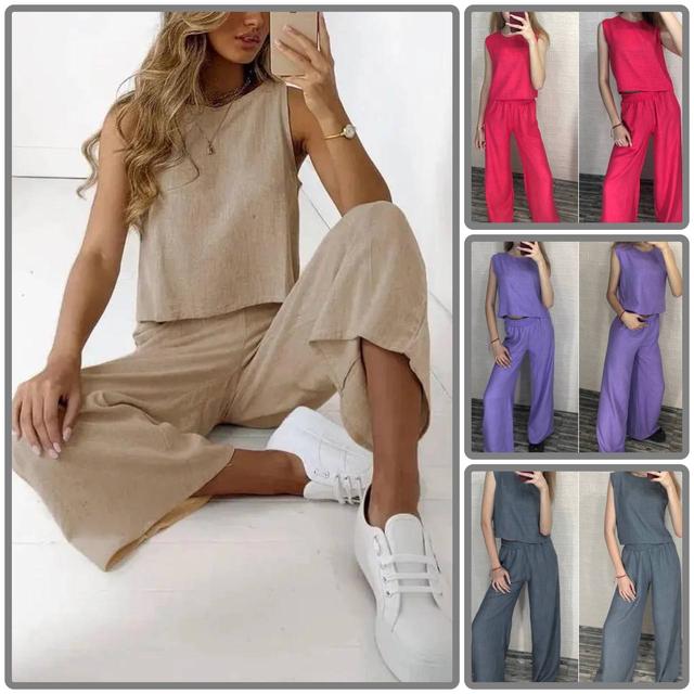 Жіночий літній костюм з льону: широкі штани та вільна майка